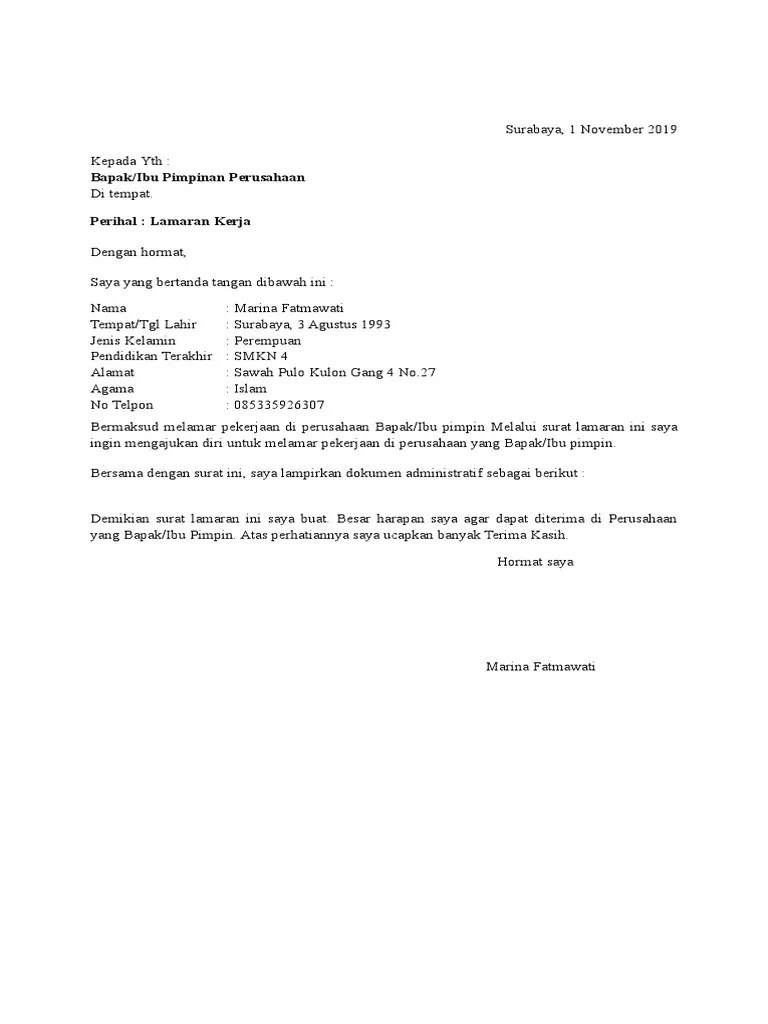 Surat lamaran kerja yang efektif dan benar berpengaruh dalam membuka potensi diterimanya seorang pelamar di sebuah posisi kerja. Lamaran kerja buat kamu yang baru saja lulus sekolah dan masih kurang paham, melamar pekerjaan merupakan kegiatan di mana kamumelakukan . Saat informasi yang tertulis di surat lamaran kerja menarik, kesempatan kamu maju ke tahap berikutnya yaitu wawancara pun terbuka. 2.buatlah contoh kalimat penutup surat lamaran kerja ! Demikian surat lamaran pekerjaan ini saya buat, besar harapan saya dapat melanjutkan ke tahap berikutnya, atas perhatian . Pastinya harus melamar kerja dulu dong, agar bisa diterima di perusahaan dan mendapat posisi seperti yang kalian inginkan . Dengan surat lamaran ini, saya bermaksud melamar pekerjaan sebagai tenaga marketing di perusahaan yang bapak/ibu pimpin. Indonesia marina shipyard adalah perusahaan yang bergerak dibidang. Lamaran di tujukan kepada pimpinan hrd pt. Bedanya, pada pelelangan kali ini tidak hanya menjual benda fisik dari lamaran . Jalan armada 50 di bandung tuliskan kesalahan pada penulisan alamat surat tersebut ! Marina nur setiyanti f3314069 d3 akuntansi c. Pada lelang di 2018, surat ini laku us$175.000 (rp2,5 miliar).